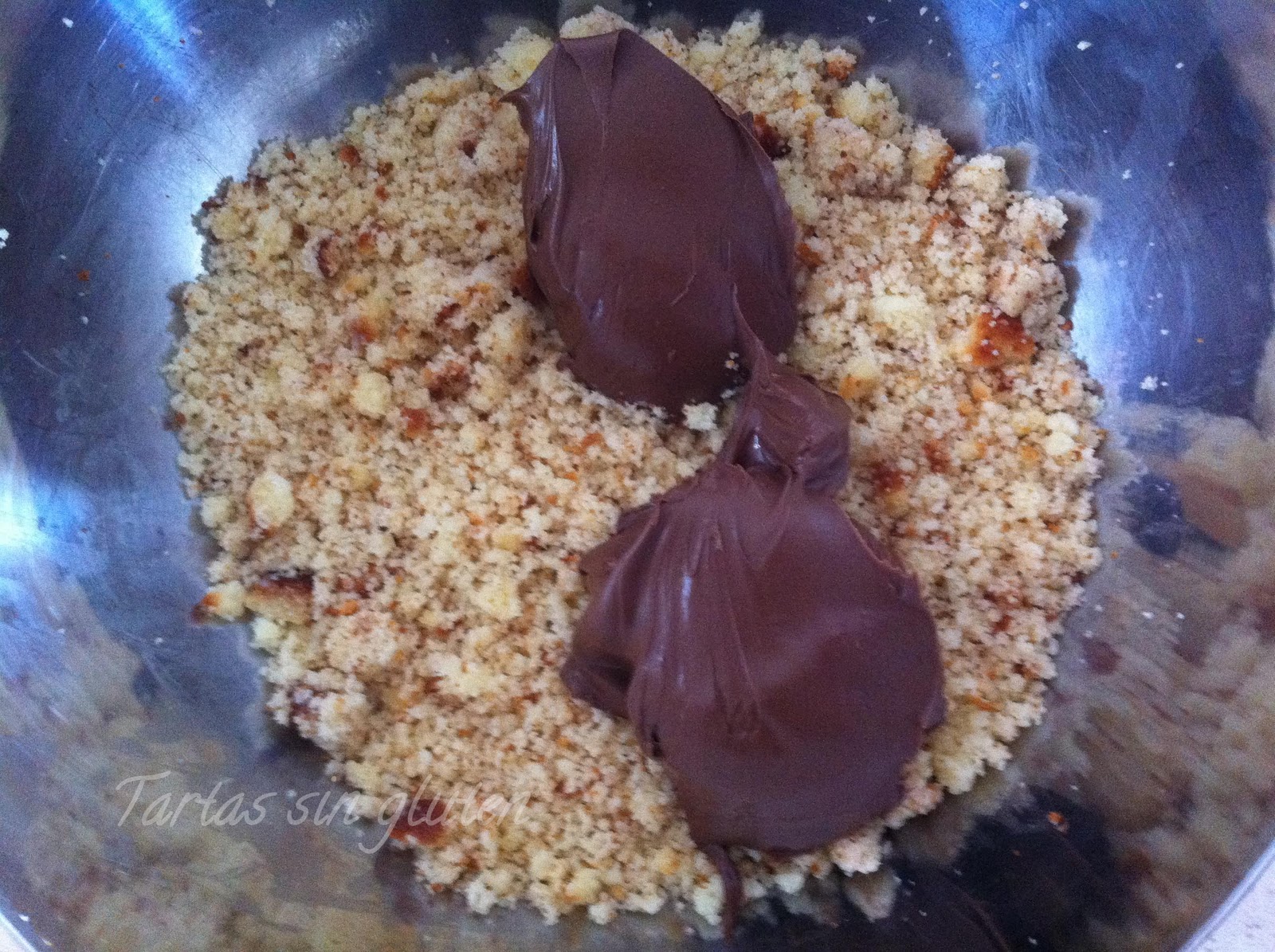 Añadimos la nocilla, poco a poco, la cantidad a veces depende de lo seco o jugoso que este el bizcocho, así que lo añadimos poco a poco y lo vamos mezclando.