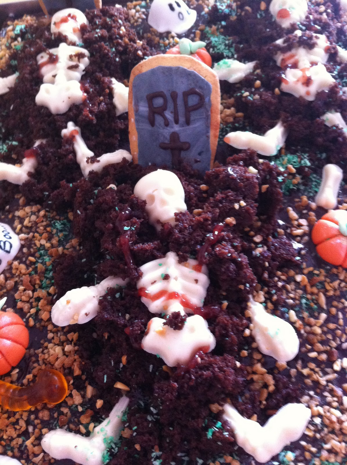 Bueno la base es un bizcocho(sin gluten), cubierto de chocolate de cobertura , lo demás es decoración, esqueletos de chocolate blanco, fantasmas de fondant, galletas lápidas calabazas de fondant, coco rayado teñido de verde y almendras .....y el Guardián del Cementerio hecho con pasta de Fondant.