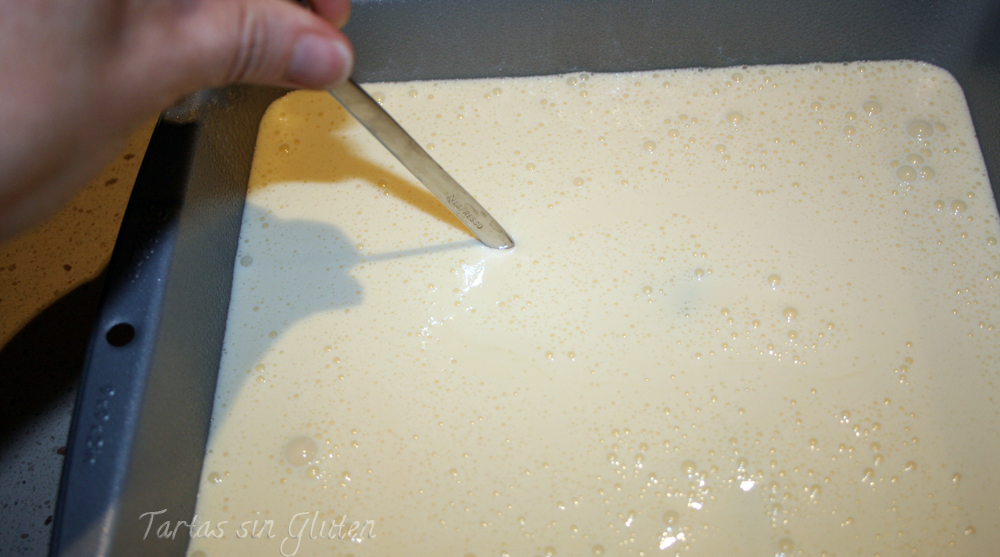 -Colocamos nuestra masa en nuestro molde cuadro( con un poco spray desmoldante o engrasado ) y con una espátula nivelamos bien , y reservamos