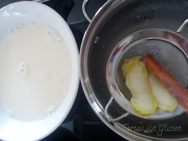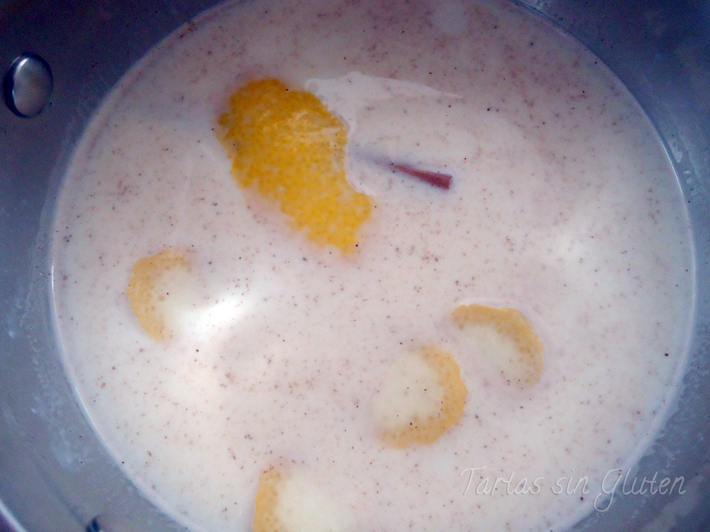 Lo primero ,ponemos la leche , la rama de canela , la esencia de vainilla y la corteza de limón a hervir suavemente unos 10 mit