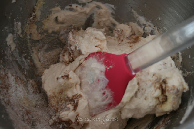 Añadimos cucharada a cucharada la mezcla reservada, de almendra , azúcar y chocolate.