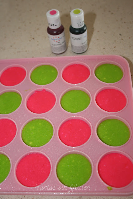 Ahora es el momento de apartar un poco de crema, para darle color...yo elegi dos colores de Americolor, .....rosa eléctrico y verde eléctrico (....la culpaple..... Lupe...yo me entiendo!!! )
