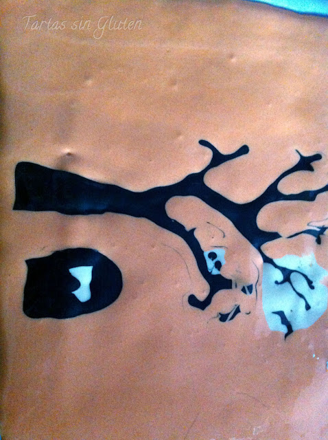 Preparamos la bandeja del horno , con un papel de hornear , donde debajo habremos colocado el dibujo el el árbol terrorífico , para poder calcarlo .