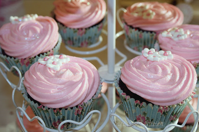 Decoramos nuestros cupcake y con unas florecitas de fondant y poco de brillantina comestible .... quedarán preciosas!!! La combinación del chocolate y fresa es perfecta!!!!