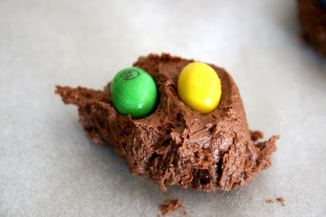 Preparar una bandeja con papel de hornear, y con la ayuda de dos cucharillas ir haciendo montoncitos, dejando una separación de unos 5 cm.