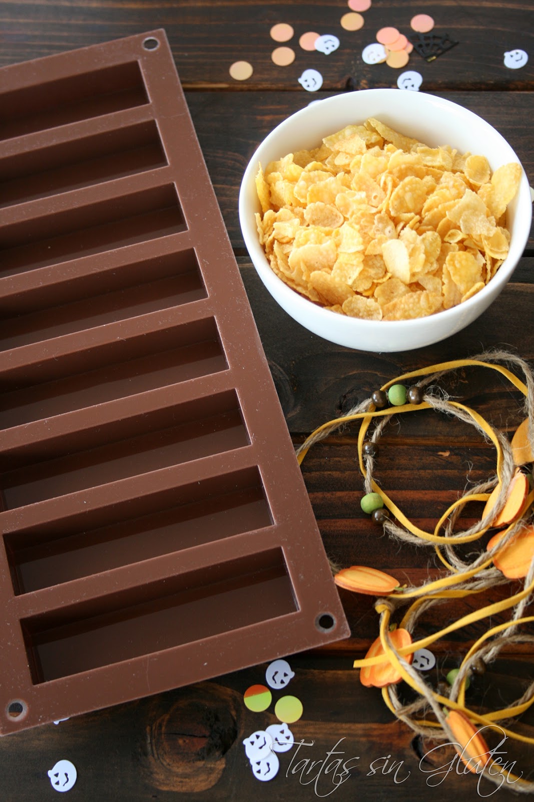 Yo concretamente he puesto primero los Minilacasitos ( colores especiales para halloween ... booo), una capa de chocolate , un capa de cereales sin gluten ( podéis usar frutos secos, trocitos de galletas etc..), y por ultimo chocolate. También podéis mezcla los tres chocolates, os quedarán preciosas las chocolatinas.