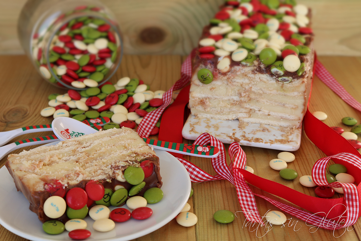 Por ultimo cubrimos generosamente la tarta con el chocolate de cobertura. Guardar en la nevera al menos unas 12 horas. A la hora de servir decorar al gusto!!! Yo use los lacasitos que son llamativos y aportan ese color típico de las navidades!!!