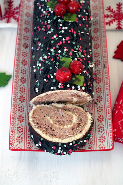 El tronco de Navidad es un dulce típico de todas las pastelerías en estas fechas. Aunque parece complicado es bastante sencillo prepararlo. Os lo aseguro!!! Esta es una de las recetas más sencillas, un bizcocho tipo soletilla elaborado con harina Mix C de Schär, un relleno de nata y chocolate y por ultimo una cobertura de intensa sabor. Podéis prepararlo de muchos sabores sencillos como de chocolate blanco o nutella o más exóticos como de turrón o de tiramisú.