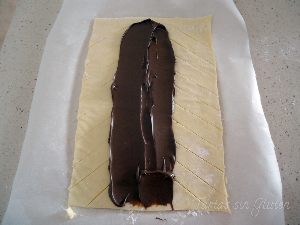 No os preocupéis si veis la nocilla , el hojaldre a hornearlo hinchará y cerrara ... de manera que el chocolate no saldrá.